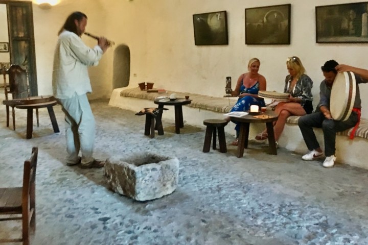 Afterward, you’ll have the opportunity to combine the fascinating past of Santorini wine and its promising future by experiencing a unique ethereal session. Meet a famous award-winning local instrumentalist in his cellar and participate in a private show in which you’ll taste ancient Greek wines of mythical varieties as recorded by historians while the musician recites Greek mythology and plays live ancient Greek music using hand-made ancient greek instruments. You will also be invited to show your musical skills as you will have the opportunity to accompany the artist!